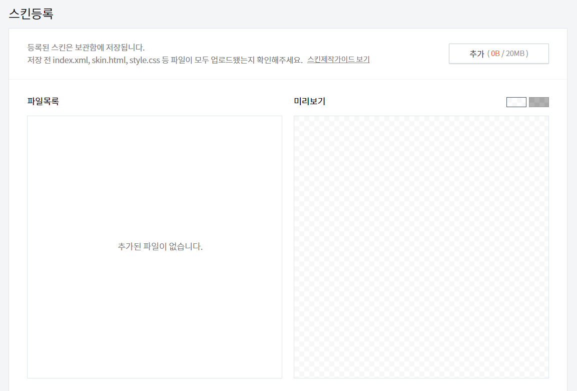 귀차니즘으로 붉은 테두리 하지 않고 간단하게 설명하겠습니다. 꾸미기 -> 스킨변경을 클릭하면 옆에 사진이 나옵니다. 거기서 스킨등록 표시 보이시죠 그것을 클릭하면 아래와 같은 사진이 나옵니다.