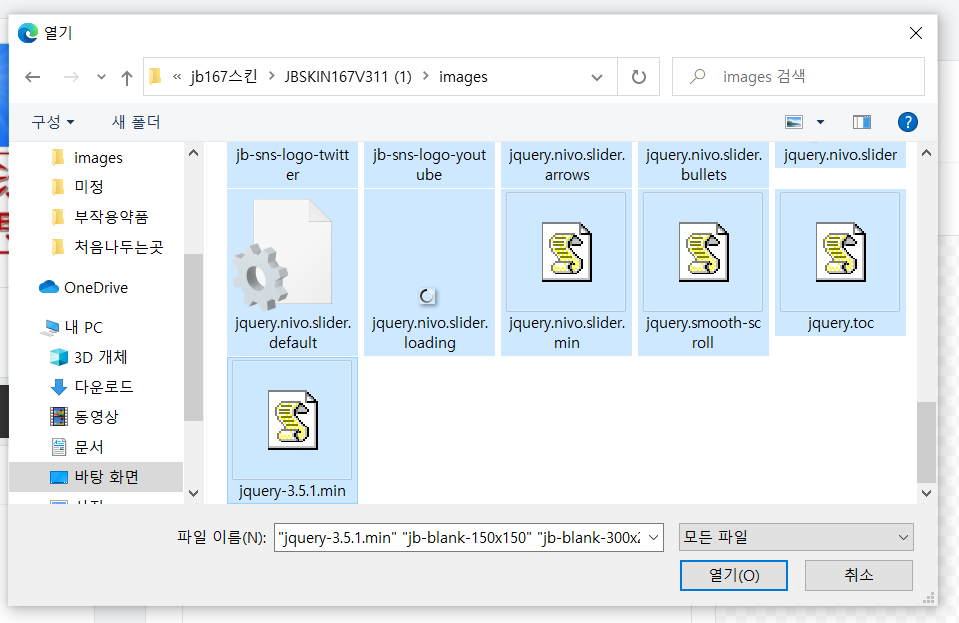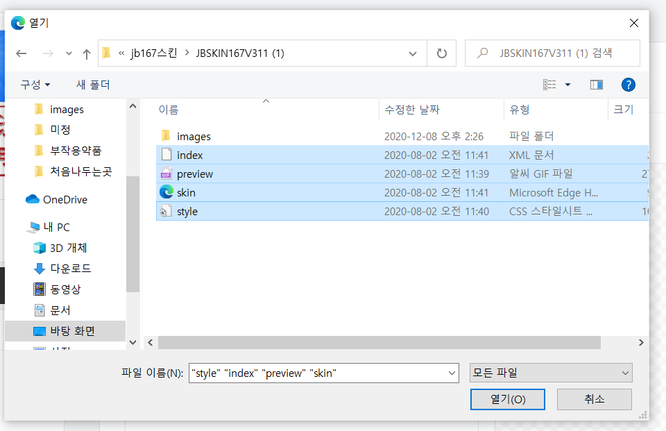 유료스킨같은 경우 당신이 받아 놓은 스킨을 추가를 눌러 해당 폴더에 있는 파일들을 올려 줍니다. jb 167스킨 경우 4가지 더블클릭하면 모두 추가가 되며, 폴더 images를 클릭해서 들어가신후 그안에 있는 파일도 모두 한꺼번에 더블클릭해주시면 모두 차가가 됩니다.