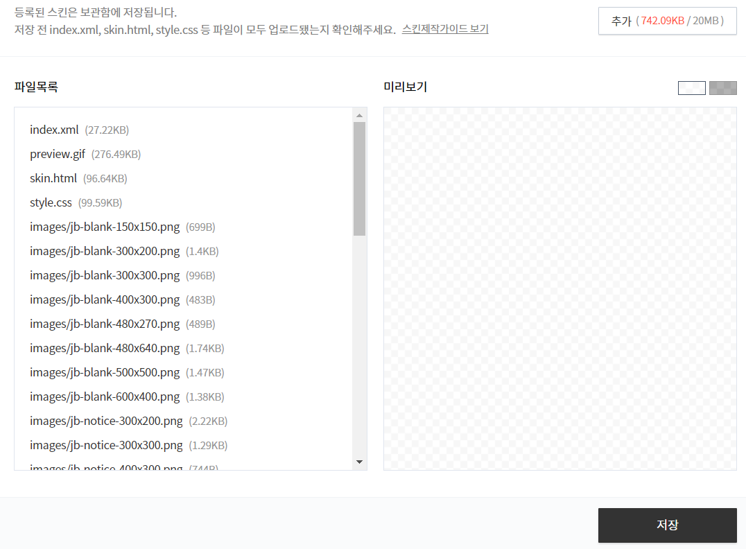 추가에 보시면 여러분이 올린 추가자료 용량이 나오고 이상이 없으면 저장을 누르시면 진행이 됩니다. 적용되는게 아니고 당신 스킨을 저장하는것이니 착각하지마세요. 적용전 파일을 다운받아 두는것 뿐입니다. 아래 사진에서 스킨등록 아래 스킨보관함을 클릭합니다.